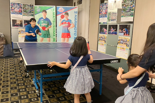 ステージでの「デモンストレーション」は、ちょうど皆さんのお昼時に出演させていただきました。選手に様々な打ち方をデモンストレーションしてもらい、コーチが解説。デモンストレーションの様子は大型ビジョンでも映し出され、遠くのお客様にもしっかり見ていただくことができました。ステージではダンスパフォーマンスが続いていた中、卓球のパフォーマンスは意外だったようですが、皆さまにお楽しみいただくことができました。
